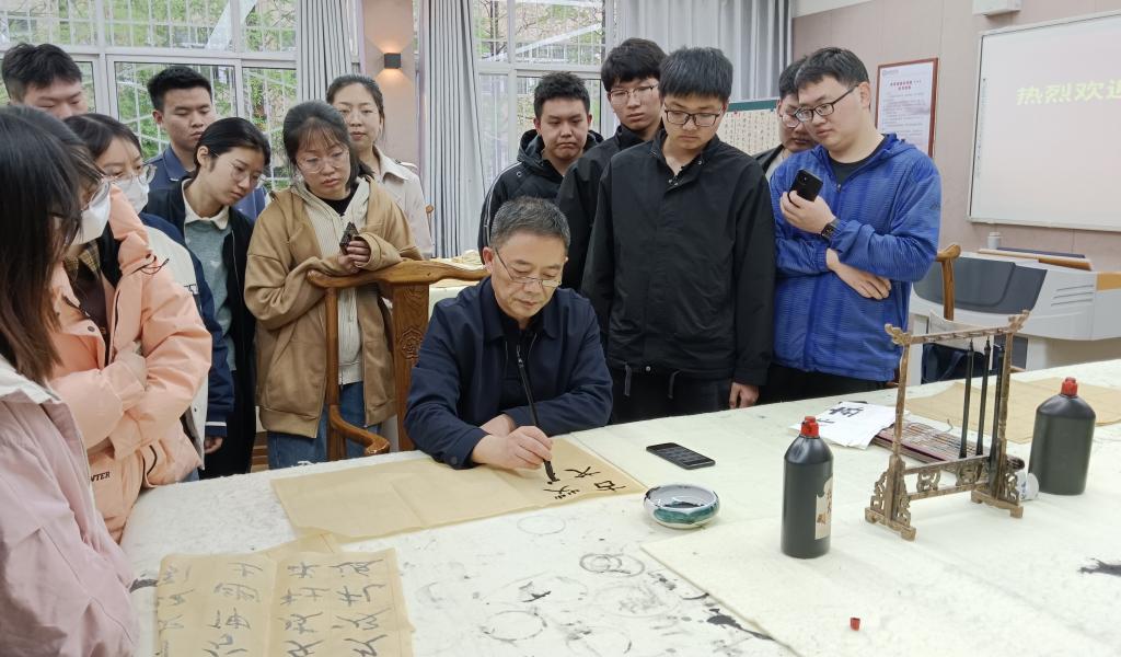 讲座交流过程中,苏光武老师将理论与实践相结合,首先基于理论的角度阐释了书写的基本知识,通过观察同学们书写时的状态、动作与方法等,提出了书法学习、选帖与练习等方面的具体建议;其次针对员工的现场作品进行了书写的技巧指导,通过亲身示范,为大家演示了隶书、行书等书体在书写时应注意的手法与笔法;最后结合实践认真回答了同学们的问题与困惑,并就师范生职业规范与教师专业能力发展对同学们书写训练提出了指导性意见。整个讲座交流过程,氛围和谐浓厚,同学们纷纷表示受益匪浅、获益良多。