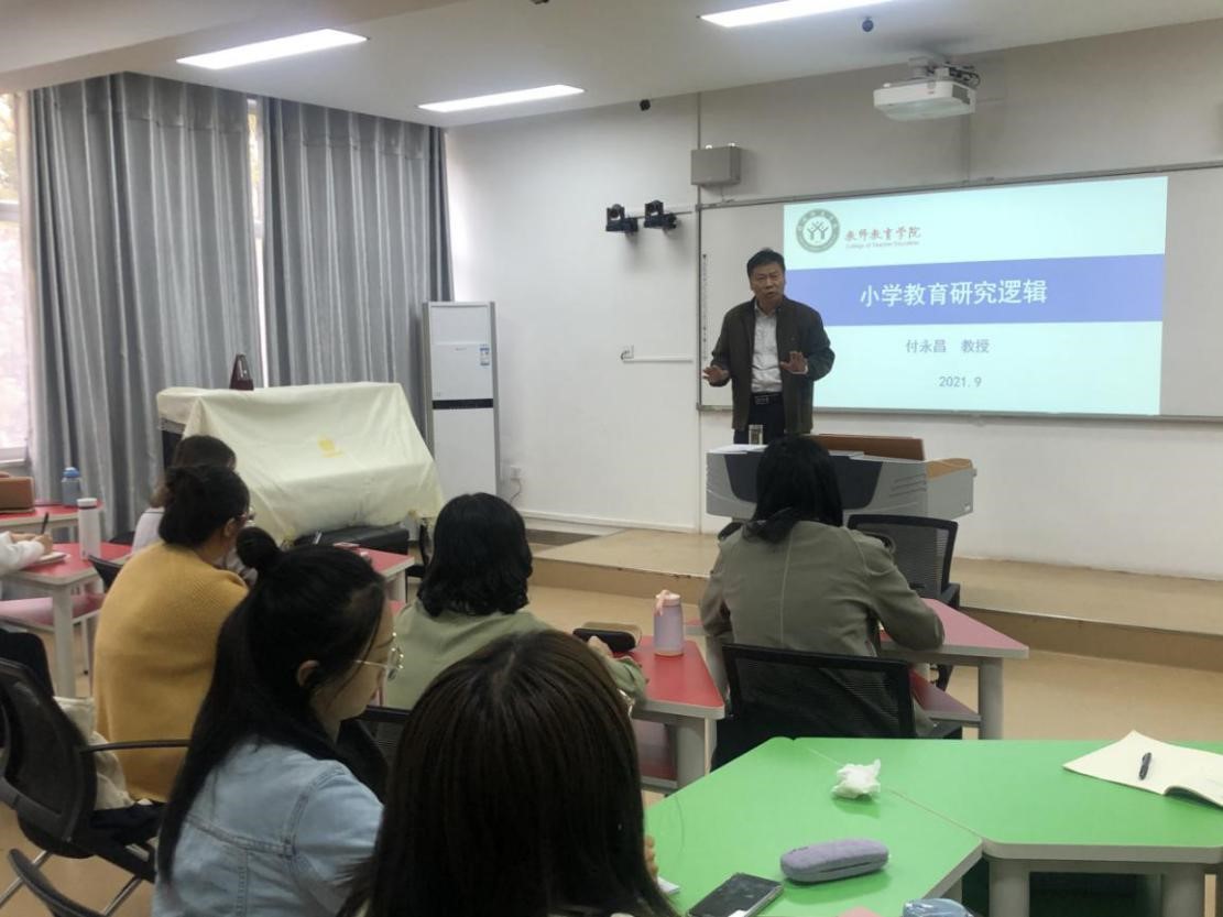 10月7日下午,伟的国际1946bv官网经理付永昌教授在教七楼402为小学教育专业2021级硕士研究生作题为“小学教育研究逻辑”的学术报告,公司研究生秘书常燕燕老师和全体2021级硕士研究生参加报告会。
