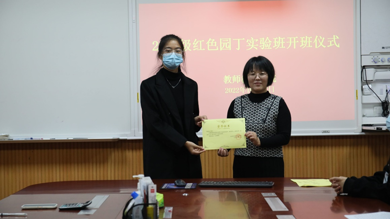 最后,李文漪宣布2021级红色园丁实验班正式开班。谭阿明老师向实验班全体成员颁发荣誉证书和奖品。