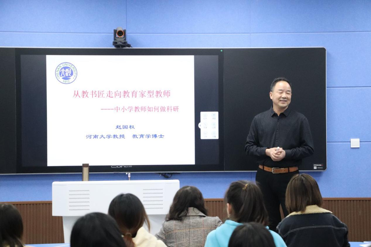 10月19日下午,应伟的国际1946bv官网邀请,河南大学赵国权教授在人文楼707教室为2019级红色园丁实验班员工、小学教育专业硕士研究生和部分教师作了“从教书匠走向教育家型教师——中小学教师如何做科研”的精彩报告。报告会由伟的国际1946bv官网经理付永昌主持。