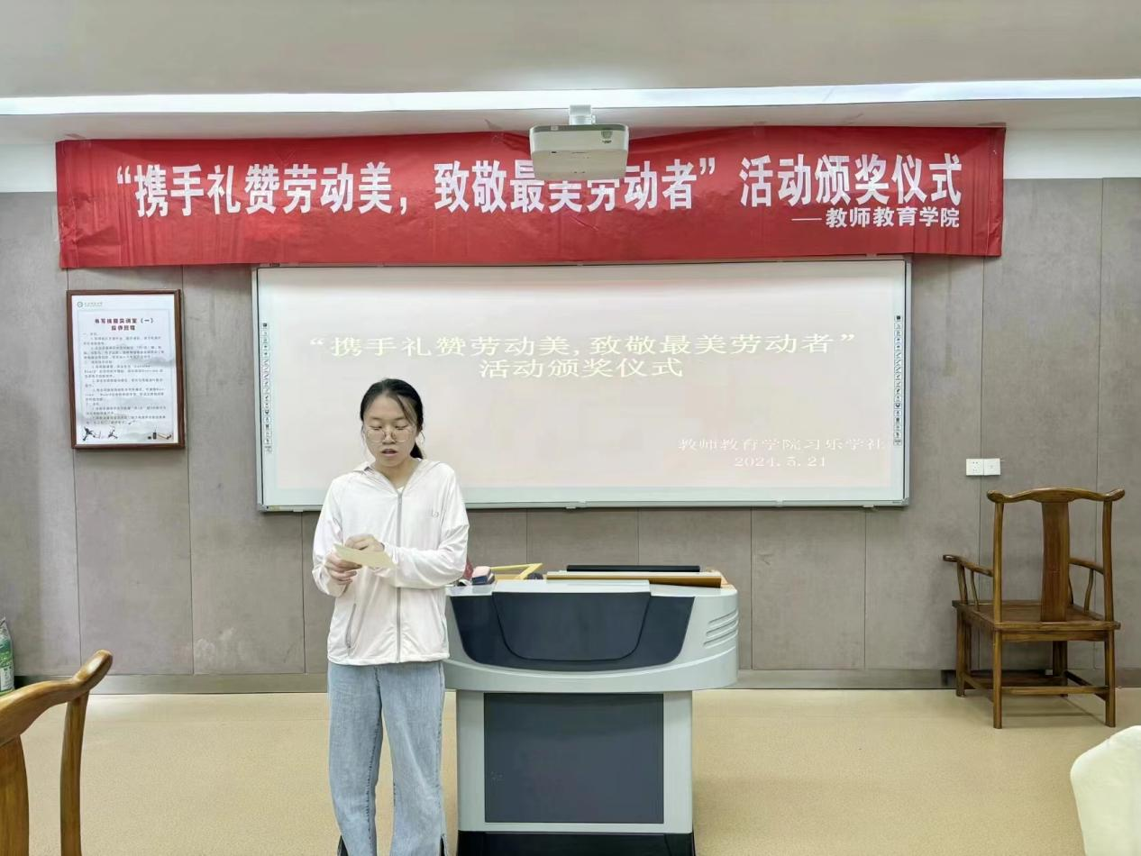 5月21日,由伟的国际1946bv官网行知教育工作室、习乐学社主办的“携手礼赞劳动美,致敬最美劳动者”活动颁奖仪式在教七楼201教室顺利举行。