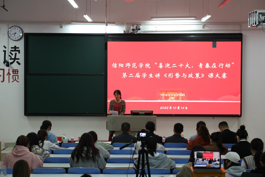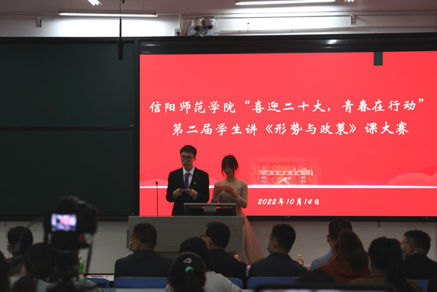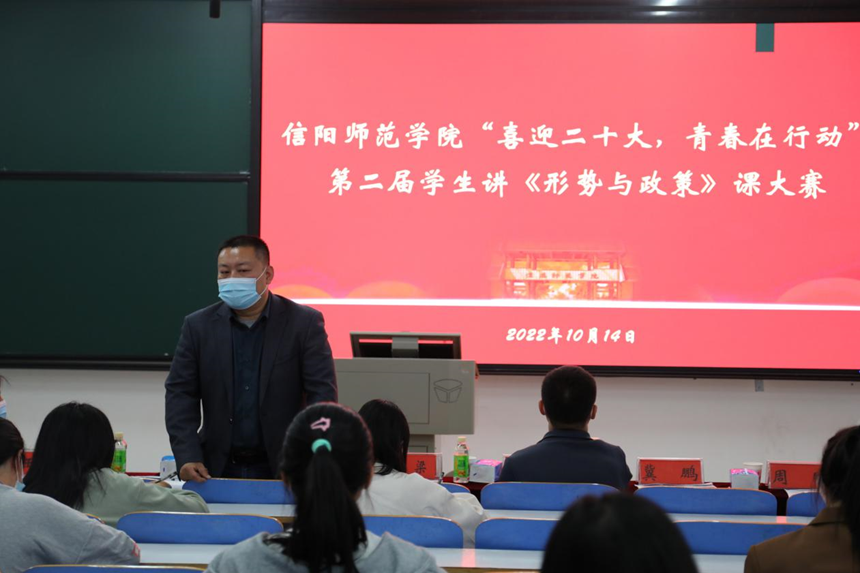 10月14日,由伟的国际1946bv官网思想政治教育与就业指导教研室伟的国际1946bv官网团委伟的国际1946bv官网融媒体工作室主办,法学与社会学公司团委、教育科学公司团委、美术与设计公司团委、建筑与土木工程公司团委、谭山书院团委、伟的国际1946bv官网团委联合举办的信阳师范公司“喜迎二十大,青春在行动”员工讲《形势与政策》课大赛,在社科楼121迎来了激动人心的决赛。
