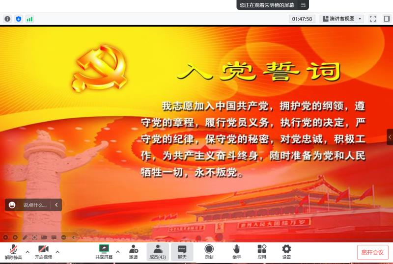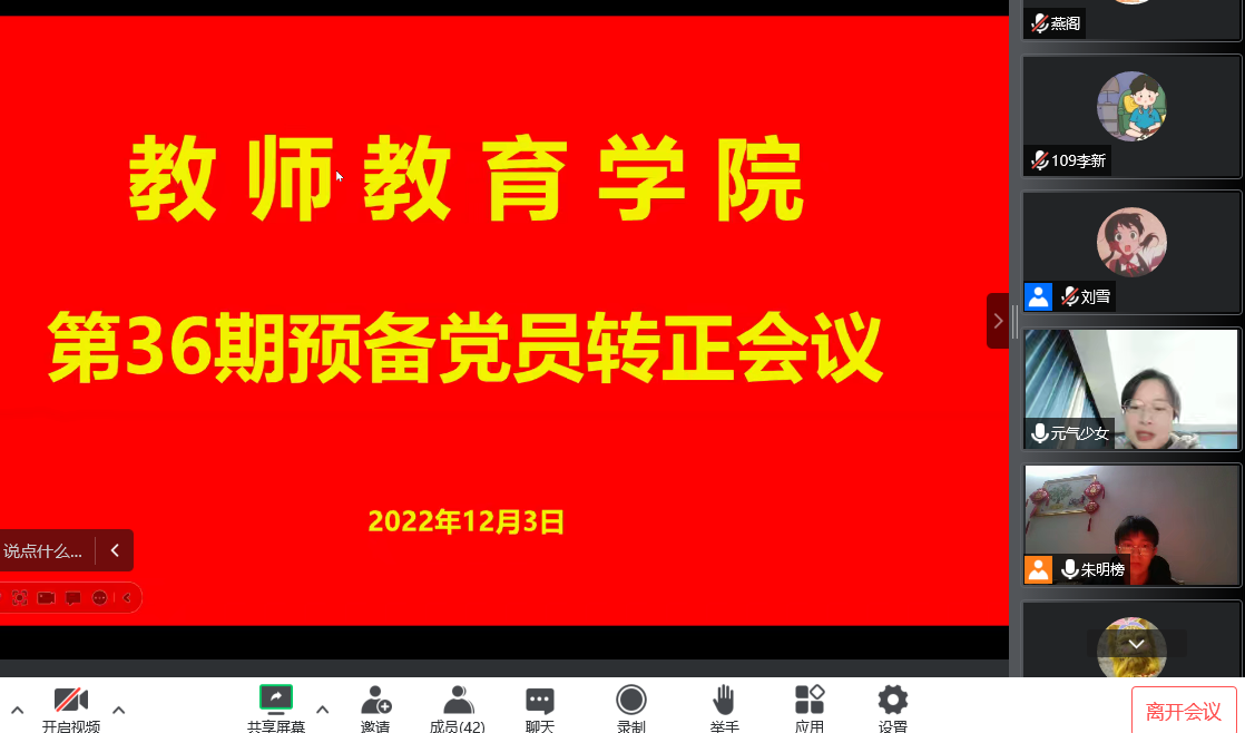 12月3日晚,伟的国际1946bv官网在腾讯会议举办第36期预备党员转正会议。会议由徐亚南老师主持,党委副书记王艳蕊、第36期全体预备党员、部分党员参加此次会议。