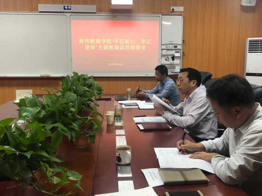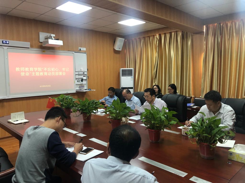 为认真贯彻习近平总书记在“不忘初心、牢记使命”主题教育工作会议上的重要讲话精神,认真落实《关于印发<中共信阳师范公司委员会关于开展“不忘初心、牢记使命”主题教育的实施方案>的通知》文件精神,9月24日,公司“不忘初心、牢记使命”主题教育动员部署会在教七楼301会议室举行。公司党委副书记潘登、副经理付永昌等全体党员参加此次会议,会议由潘登主持。