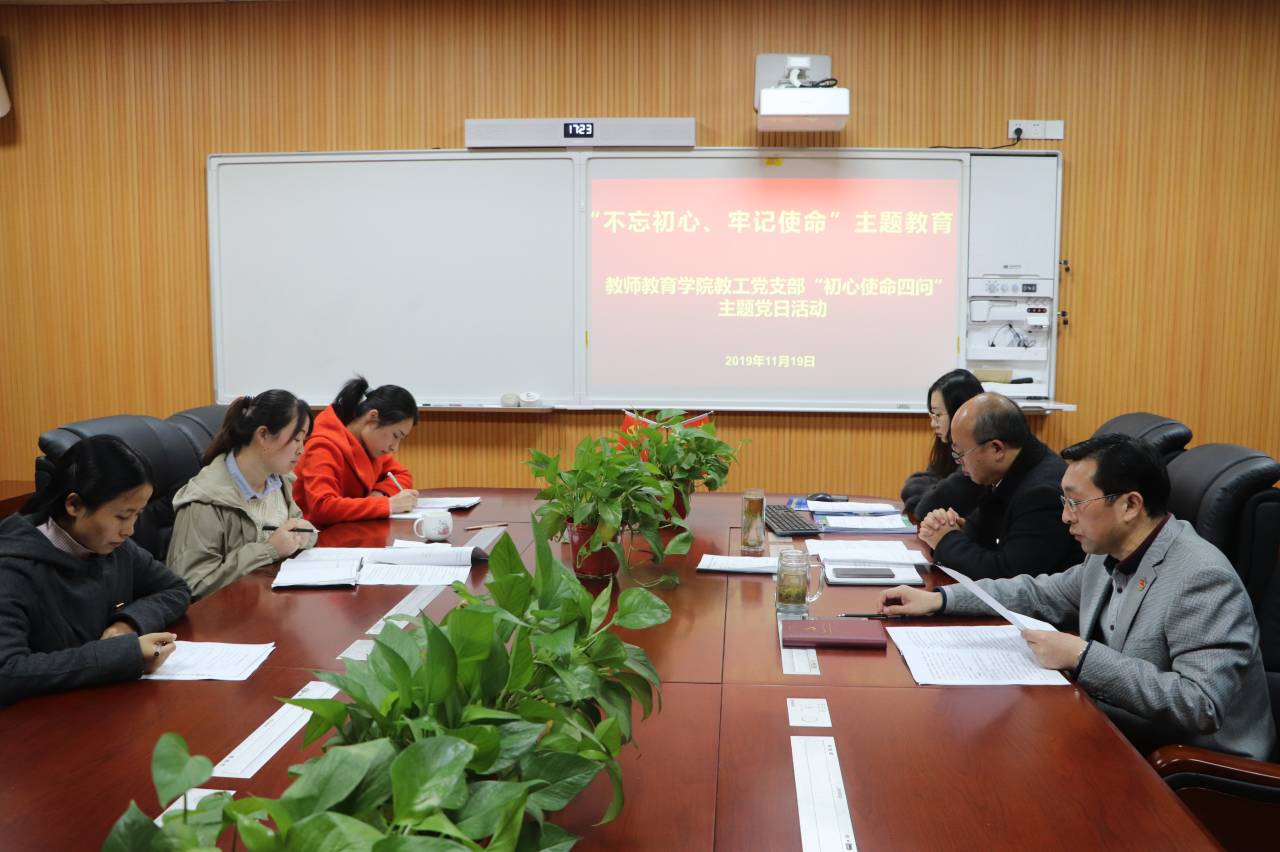 为推动“不忘初心,牢记使命”主题教育走深走实,根据省委主题教育领导小组办公室《关于在第二批“不忘初心、牢记使命”主题教育中开展党员“初心使命四问”主题党日活动的通知》文件精神,伟的国际1946bv官网员工党支部、教工党支部分别于11月18日、19日在教七楼301会议室组织开展“初心使命四问”主题党日活动。