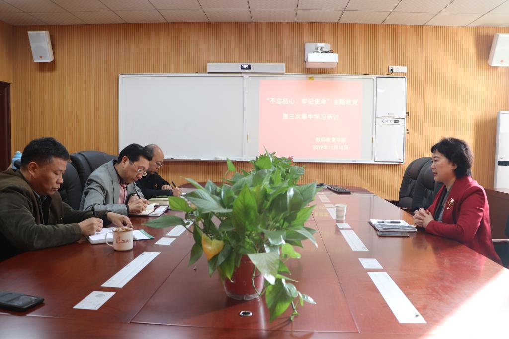 与会人员集中学习研讨党的十九届四中全会精神后,潘登从理论学习的形式、内容、成效、党课开展的情况、调查研究的成果、检视问题的情况、整改落实的措施等方面汇报了公司主题教育工作开展情况;付永昌从小学全科教师专业特色、团队队伍建设等方面汇报了公司的建设发展情况。潘登表示,公司全体师生党员把学习党的十九大精神、十九届四中全会精神、党章党规作为当前首要政治任务,根据“不忘初心、牢记使命”主题教育的要求,开展了丰富多样的学习形式,并结合工作实际,认真开展调研活动,总结了公司关于基层党组织建设、人才引进团队队伍建设、教师教育实训中心建设、科级干部队伍建设、团学等方面的工作,不断完善制度体系,加强整改落实,确保各项工作在主题教育活动的推动下积极开展、落细落实、取得实效。