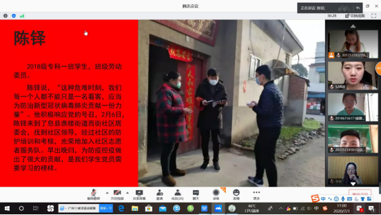 会议伊始,与会党员在仇庭慧的领誓下重温了入党誓词。接着,员工党员集中学习了疫情期间以钟南山院士和李兰娟院士为代表的感人事迹及伟大精神,与会成员纷纷表示,将会认真学习两位院士为国为民、无私贡献的高尚品质,树立正确的人生观、价值观。其中,18级专科一班入党积极分子防疫控疫先锋代表陈铎讲述了自己在疫情蔓延时期经过严格防护培训和考核,加入社区志愿者服务队的所做所感,他认为,在志愿者服务队为战役的初步胜利贡献一份青春力量是极其光荣的,员工党员应该不忘初心,牢记使命,发挥先锋模范带头作用。在“我想对党说句话”暖心时刻,全体党员都表达了对共产党生日的祝福和实现中华民族伟大复兴的美好祝愿。