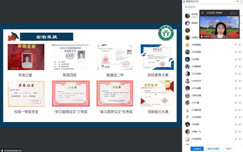 国际教育公司国家奖学金获得者张雪柯、文公司校园明星获得者叶璐怡、旅游公司自强之星获得者杨擎擎依次向同学们讲述了她们的青春故事。张雪柯通过讲述四个“选择所热爱,热爱所选择”的故事,成长遇到挫折时,乐观面对,学习的路上,奋勇向前。鼓励同学们要矢志不渝地坚持每一个选择与每一份热爱;叶璐怡用信仰之卷、担当之卷、实践之卷、自强之卷,分享了自己奋斗的青春,她以“路长不及心远,天阔不过眼高”激励自己一路前行,呼吁同学们要以昂扬且谦卑的姿态去自信生长;杨擎擎围绕“筑梦新时代,青春谱华章”,分享了自己多彩的校园生活和未来目标,她怀揣热血和梦想,在自强的路上坚定前行,成为自己的一束光。