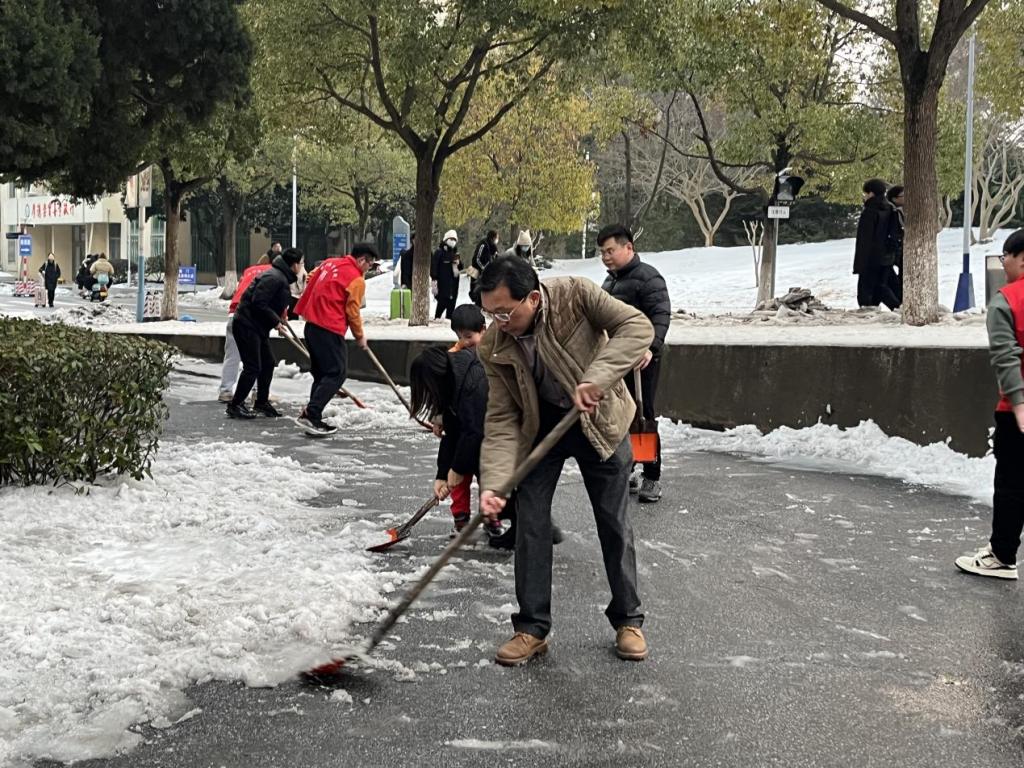 活动开始,大家带着各自的扫雪工具,兵分几路,分别清扫了教四、教六、教七前道路上以及外跨楼梯上的积雪。为了清扫干净主干道上的积雪,师生们有的用力铲,有的紧随扫,还有的负责把雪运送到路边,彼此默契合作,进展顺利。在大家的共同努力下,各主干道上的冰雪很快被铲除干净。为新学期员工上课开辟出一条通畅的道路。在潘书记的带领下,师生们不畏冬日的寒冷,清扫工作开展得热火朝天,为这个冬天增添了一份特殊的温暖。