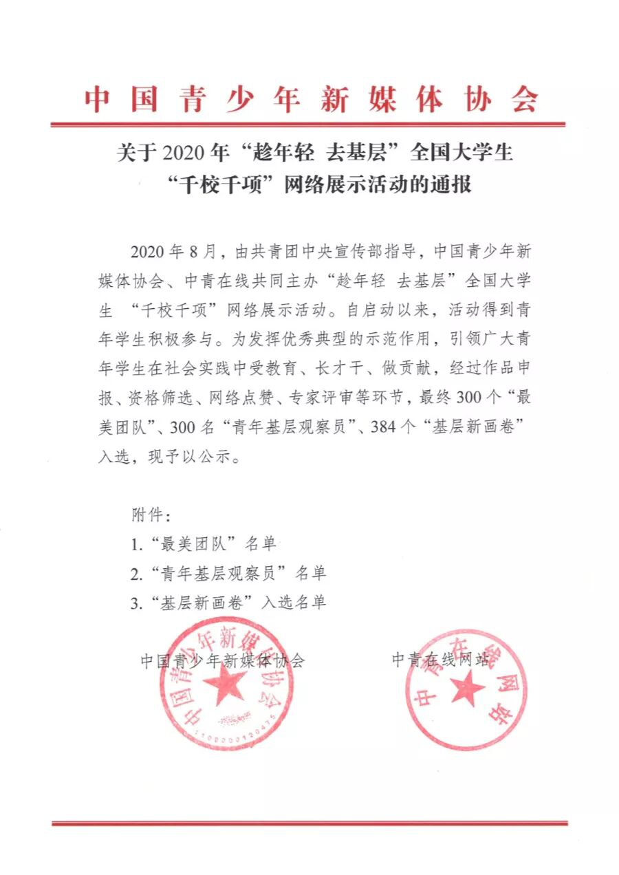 11月13日,由共青团中央宣传部指导,中国青少年新媒体协会、中青在线共同主办的“趁年轻 去基层”全国老员工“千校千项”网络展示活动经过作品申报、资格筛查、网络点赞、专家评审等环节,公示了“最美团队”、“青年基层观察员”、“基层新画卷”入选名单,公司“‘疫’路同行,‘益童’成长”教育关爱服务团作品和南开大学,南京师范大学等300余所高校共同入选,其中,“‘疫’路同行,‘益童’成长”教育关爱服务团入选“千校千项”基层新画卷,服务团成员陈耀隆入选“千校千项”青年基层观察员。